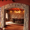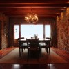 Techo de manta gravillada colocado sobre estructura de madera de lenga, revestimiento exterior de piedra ladraba con junta tomada y traslapo de lenga.