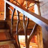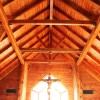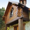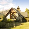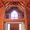 Techo chapa gravillada Decka shake sobre estructura de ciprés, revestimiento exterior en piedra labrada y tronco cabañero, aberturas en lenga con DVH pisos interiores en piedra laja regular con detalles en madera.