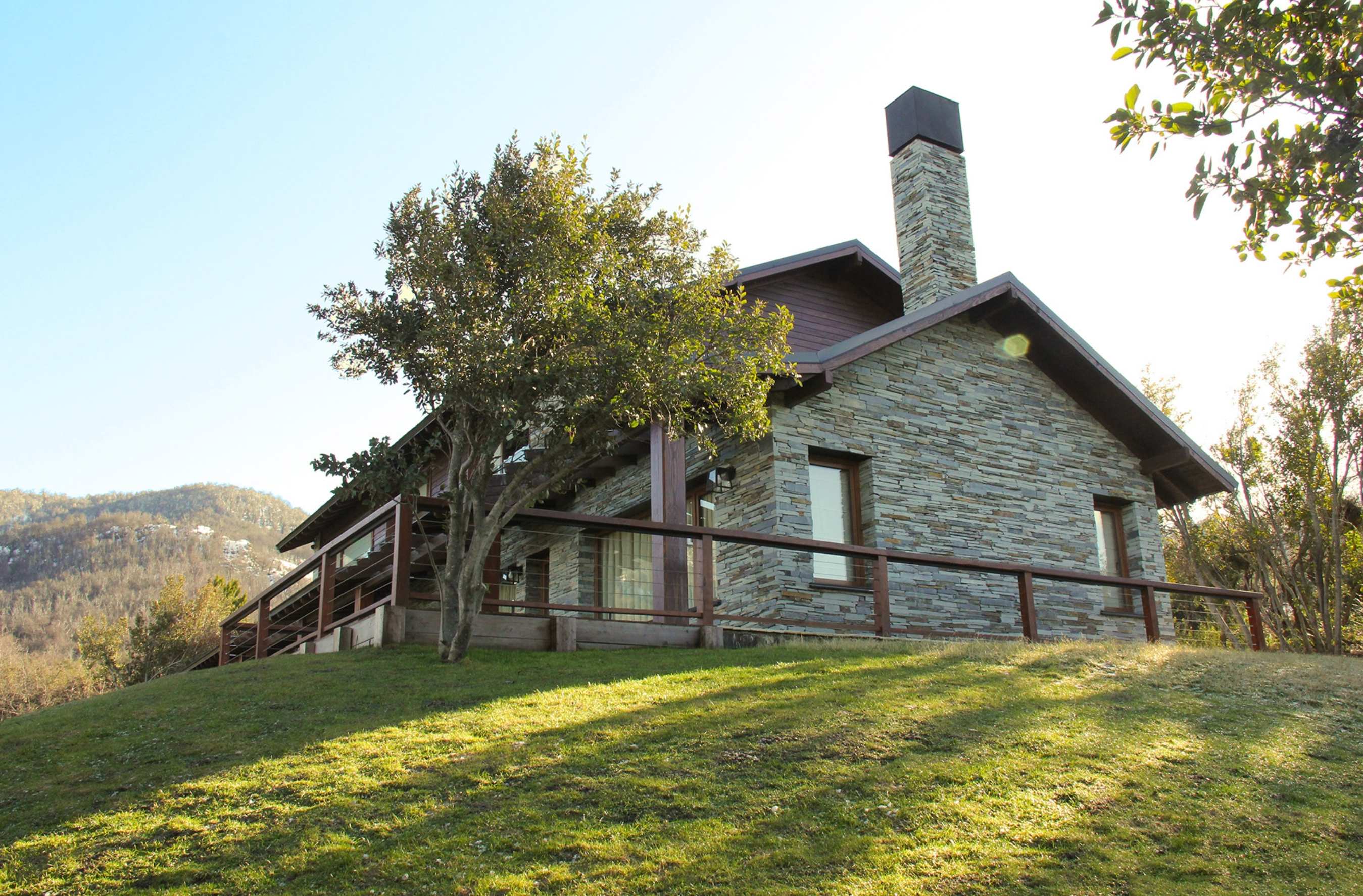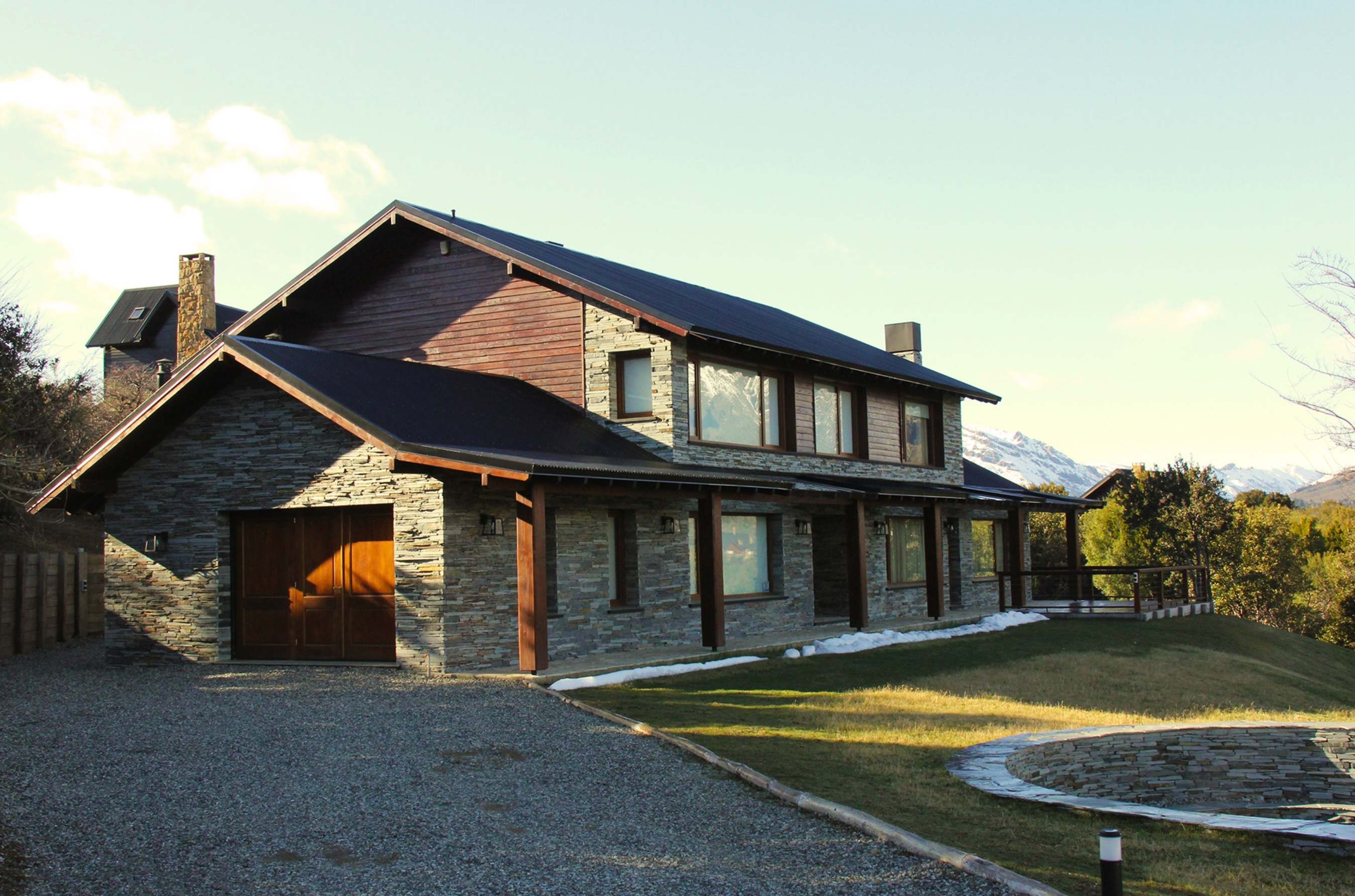 Techo de madera de Oregón bajo cubierta de chapa prepintada negra, revestimiento exterior de pirca San Luis y traslapo de Oregón, aberturas de PVC foliado con DVH, piso de madera de lapacho hidrolaqueado.