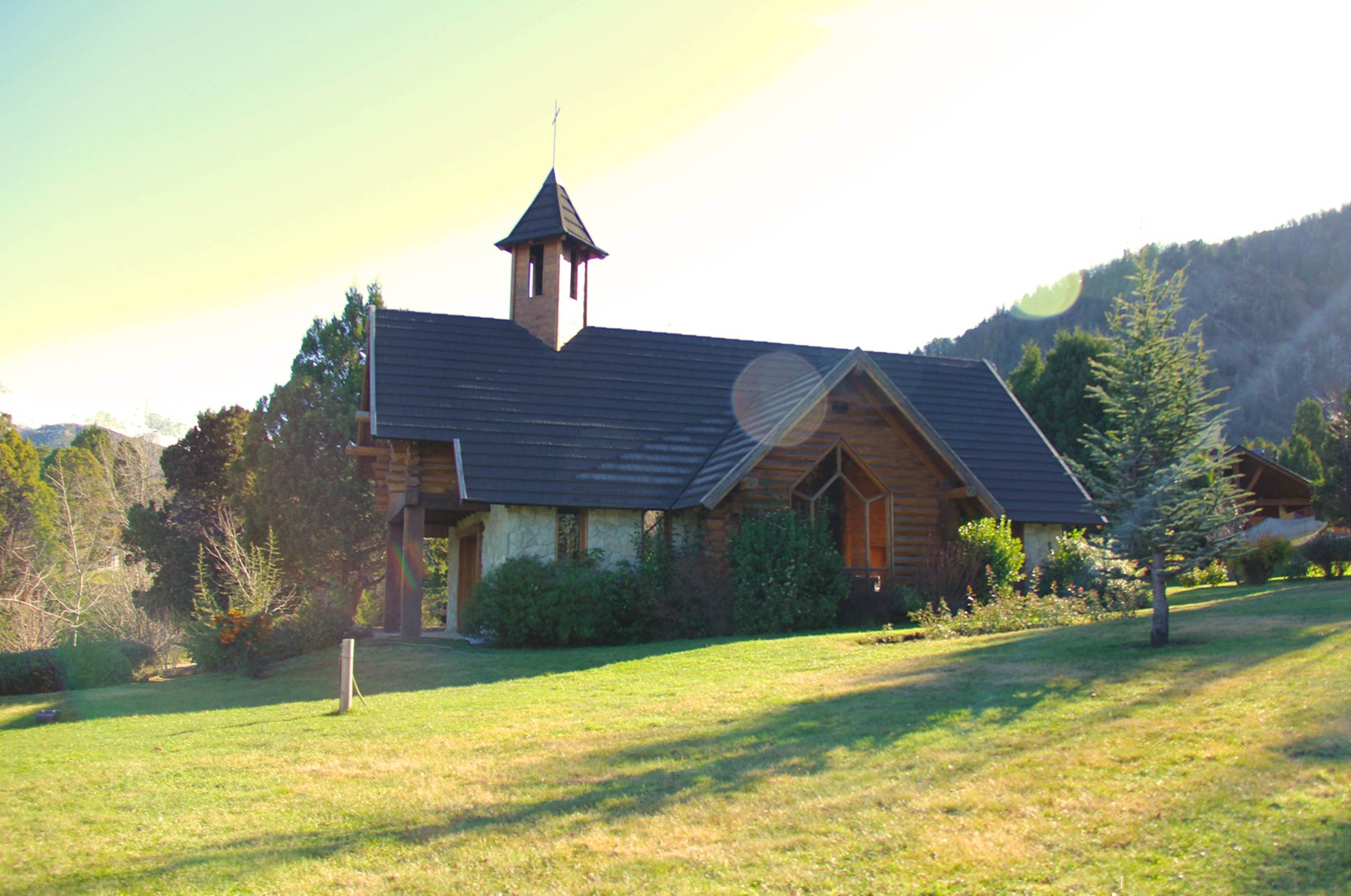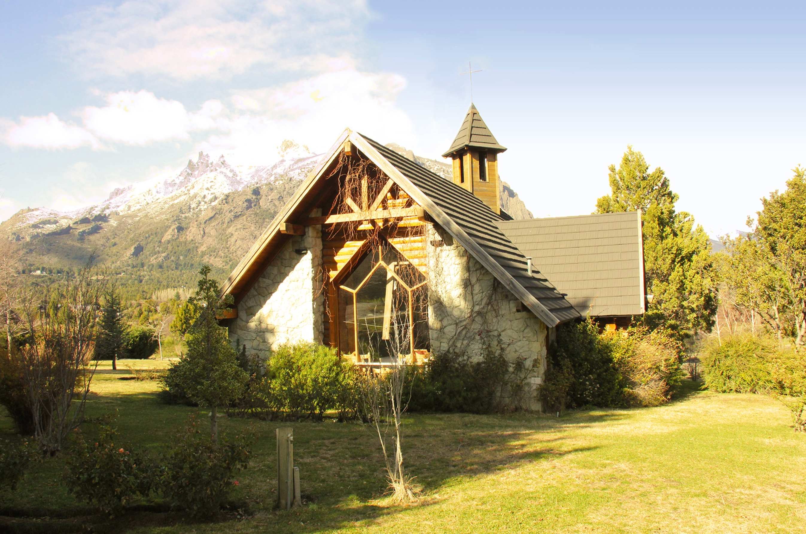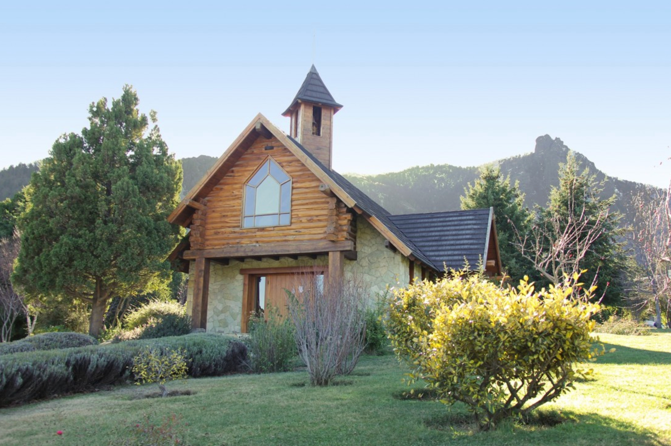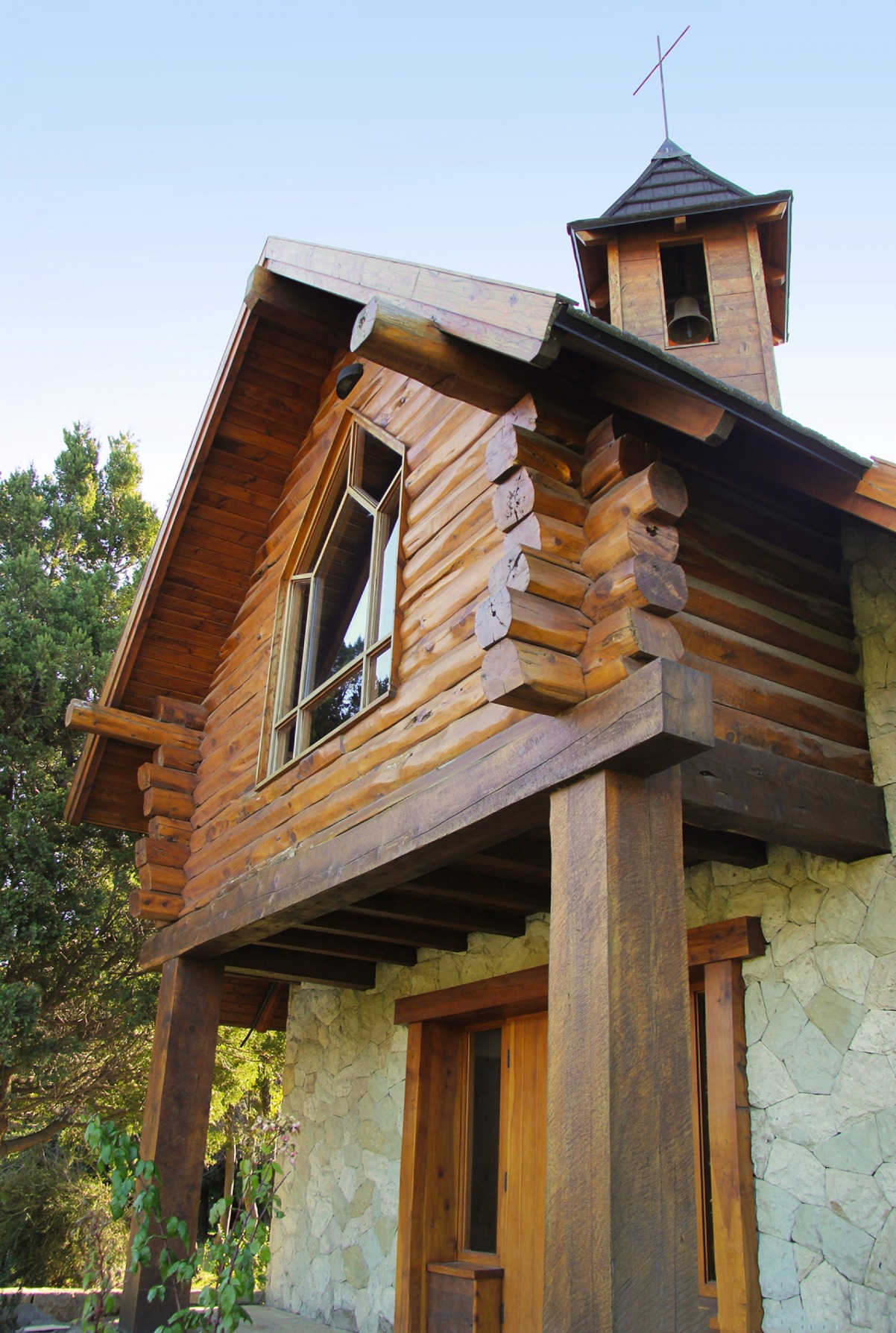 Techo chapa gravillada Decka shake sobre estructura de ciprés, revestimiento exterior en piedra labrada y tronco cabañero, aberturas en lenga con DVH, pisos interiores en piedra laja regular con detalles en madera.