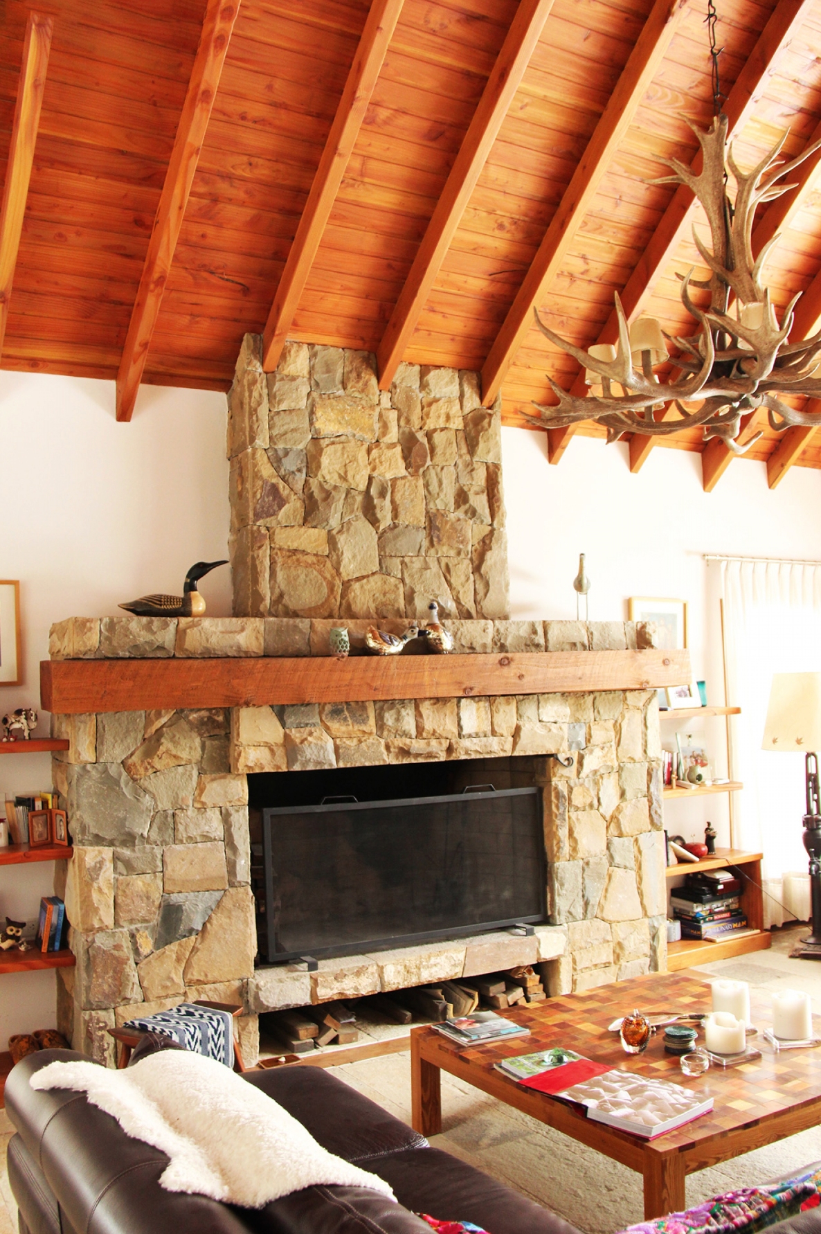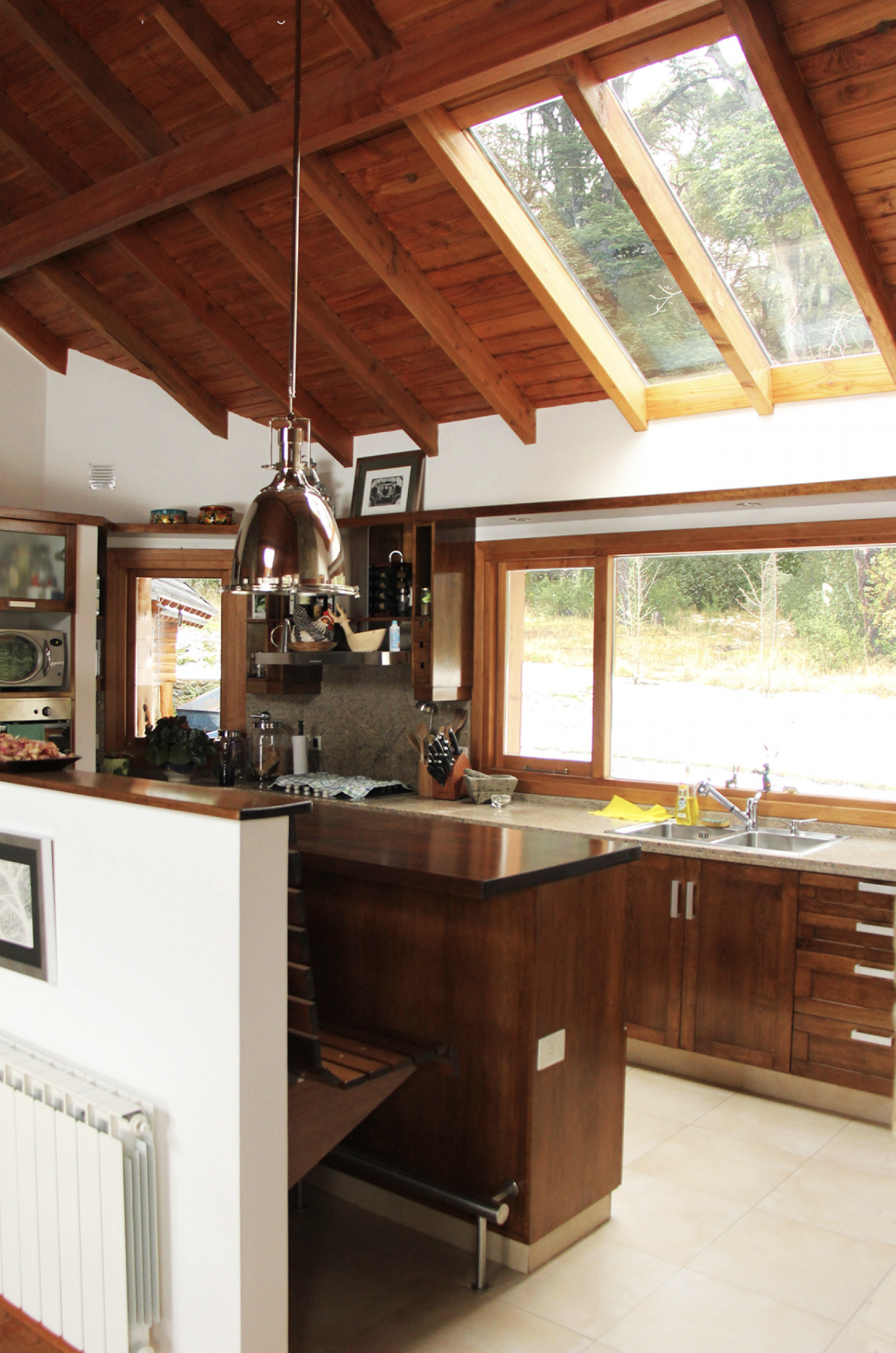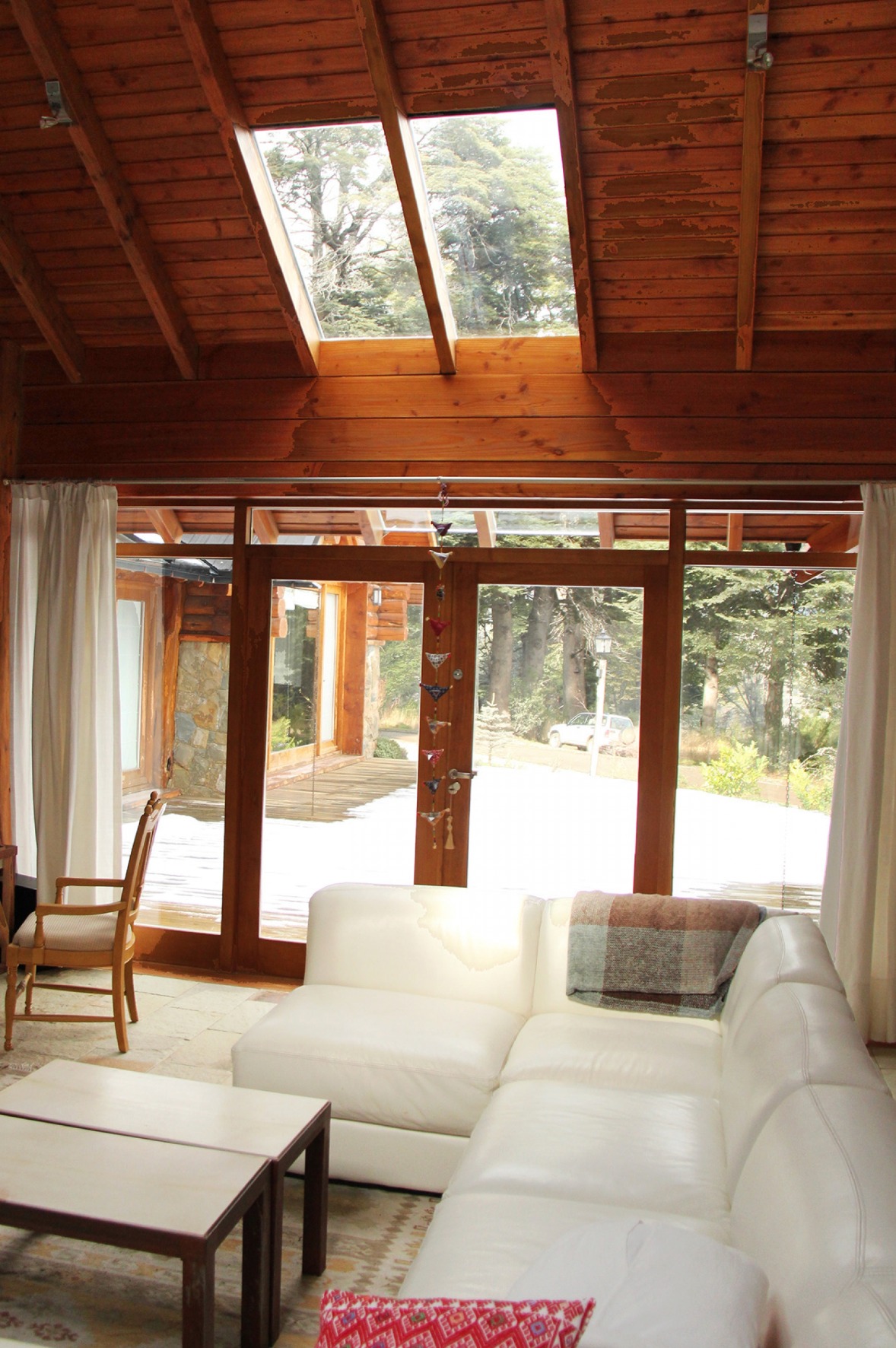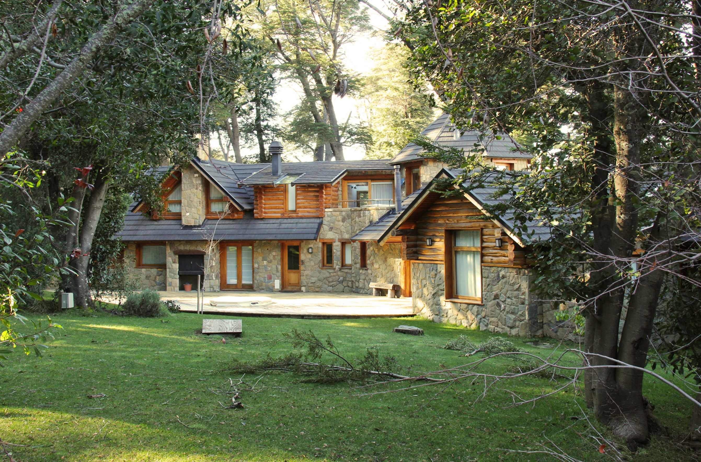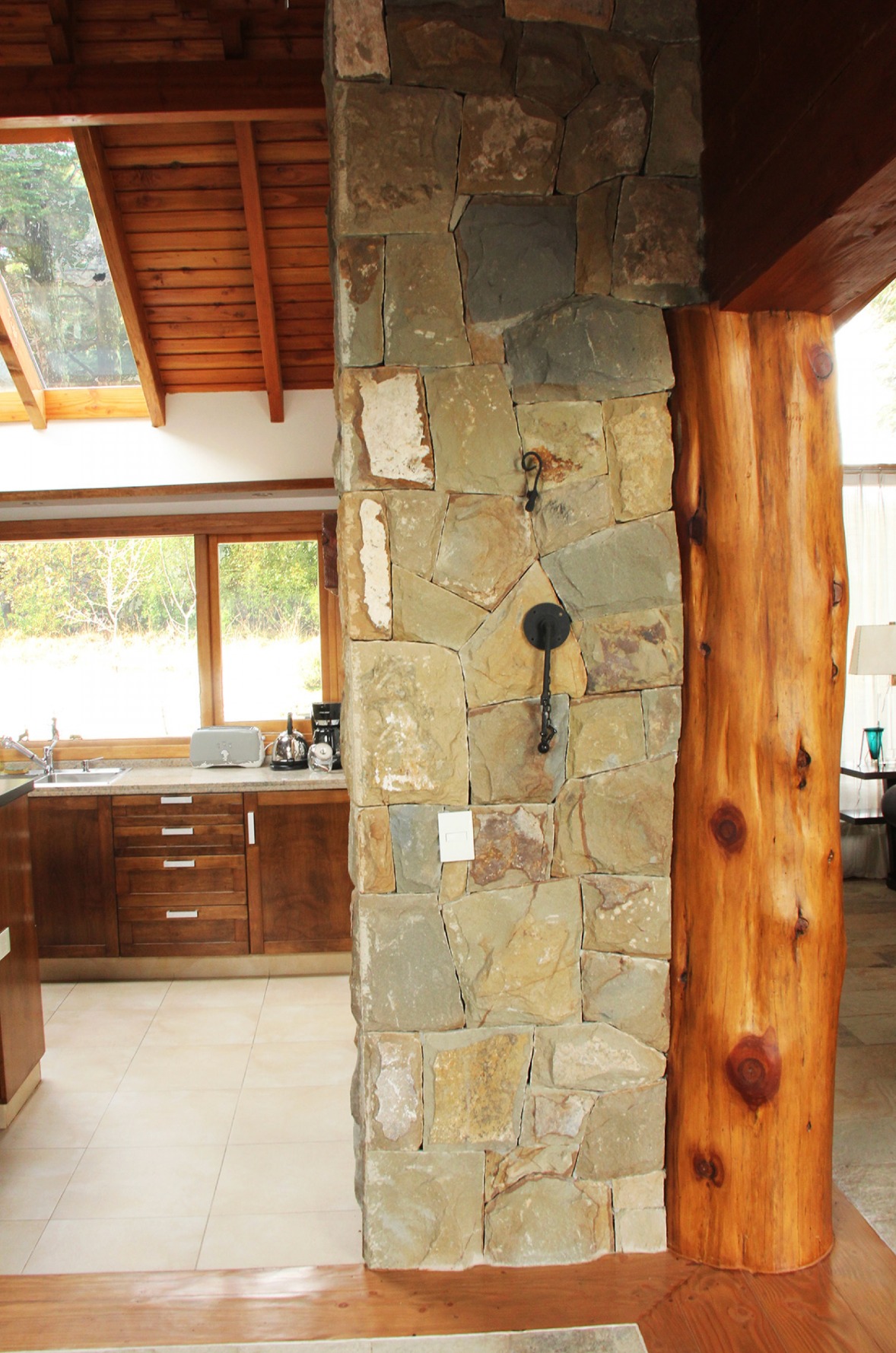 Techo chapa gravillada Decka shake sobre estructura de oregón, revestimiento exterior en piedra labrada y tronco cabañero, aberturas en lenga con DVH pisos interiores en piedra laja regular con detalles en madera.